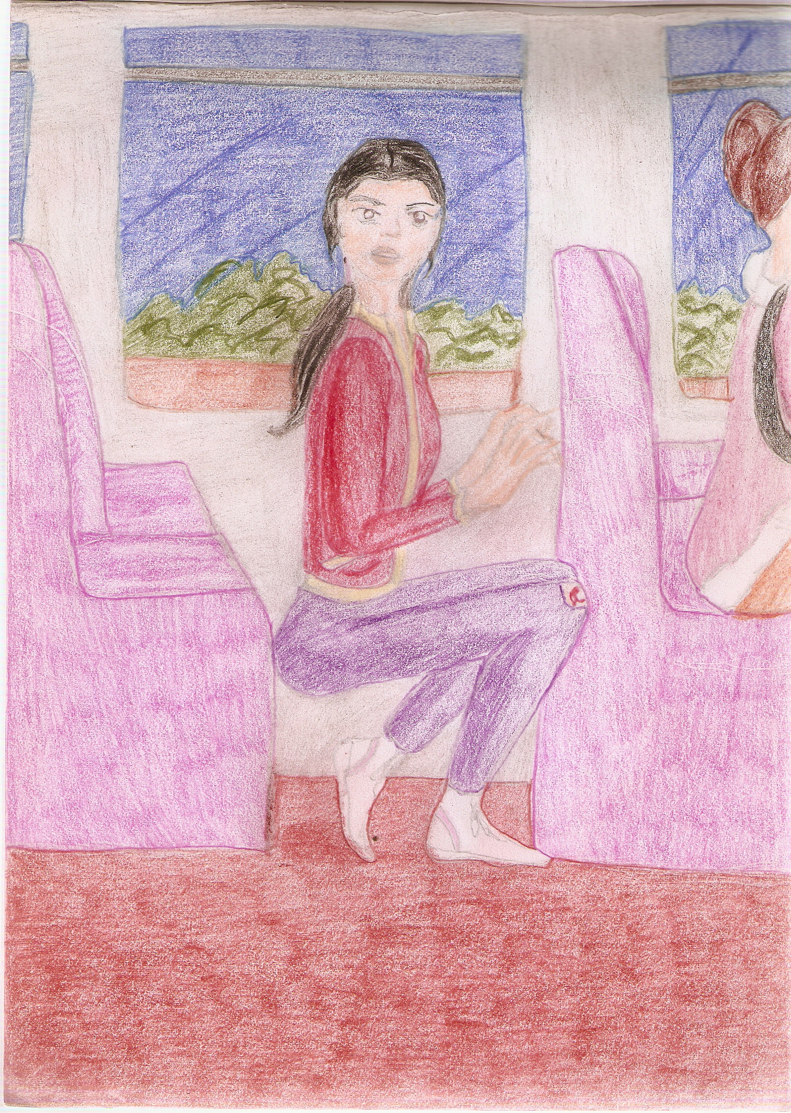 О, это иллюстрация к моему рассказу: героиня сбегая от бандита упала, разбила коленку и порвала штанину, а в автобусе собралась прятаться между сидениями, чтобы её не заметила кондуктор. Героиню зовут Лена и ей 16 лет.))